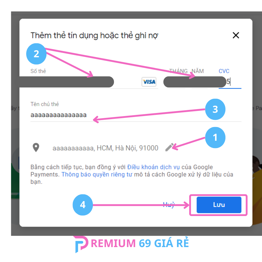 Bước 3: Chọn quốc gia tại vị trí số 1. Sau đó, điền thông tin số thẻ và ngày tháng năm và CVC. Điền tên chủ thẻ bất kỳ. Bấm “Lưu”