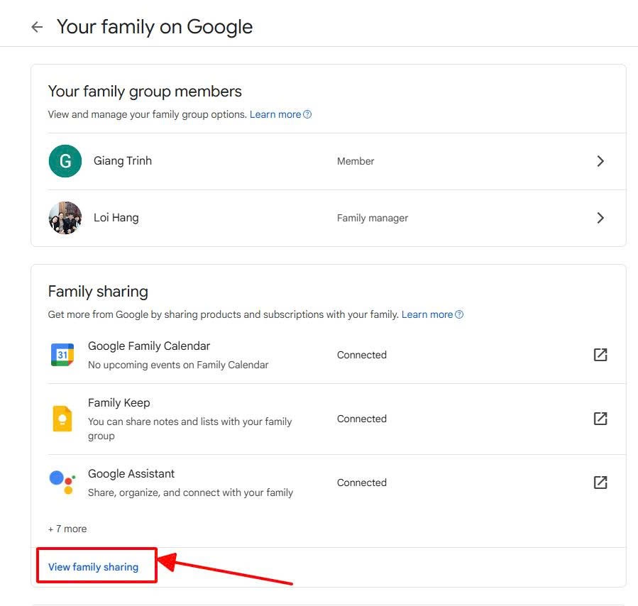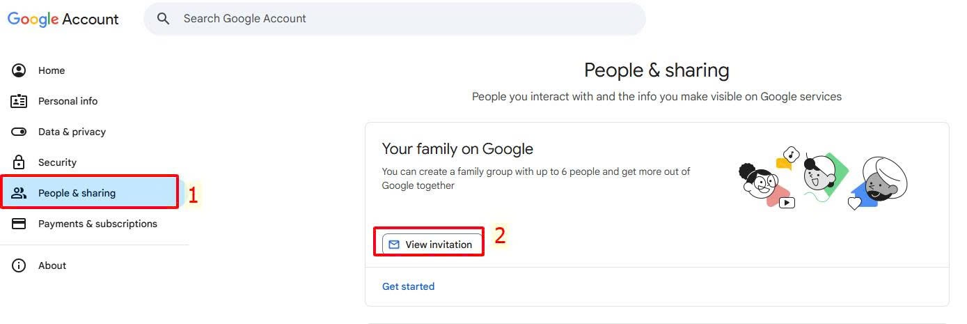 Bước 1: Truy cập: https://myaccount.google.com/people-and-sharing và thao tác như trong ảnh chọn “View invitation”