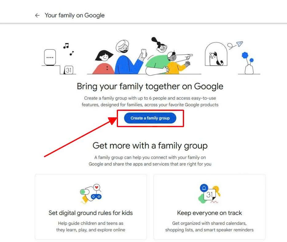 Bước 1: Truy cập link: http://g.co/yourfamily . Để tạo nhóm gia đình. Chọn “Crete a family group”